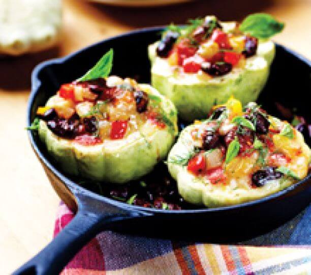 Wrzuć czosnek z cebulą. Gdy się zeszklą, dodaj resztę warzyw, zamieszaj i wrzuć drobno pokrojony miąższ z patisona. Przypraw do smaku, oprósz skrobią kukurydzianą i ewentualnie podlej wodą. Dodaj fasolę i zioła, wymieszaj. Każdego patisona nafaszeruj warzywami, przykryj plasterem sera, skrop oliwą, oprósz pieprzem i wstaw do piekarnika na 25–30 minut (200°).